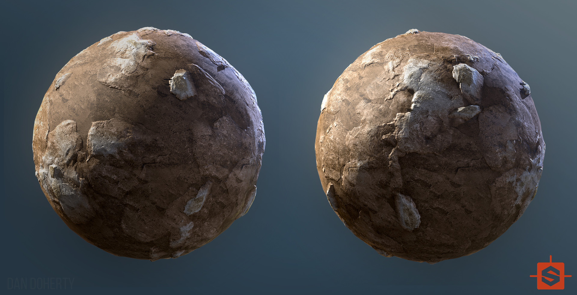 Material study of medium sized rocks sitting on grassy dirt. All done in Substance Designer and rendered in Marmoset Toolbag 3.